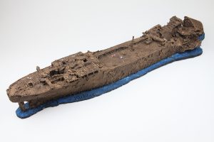 The bow section is heavily damaged from bombing, giving the wreck a dramatic look.